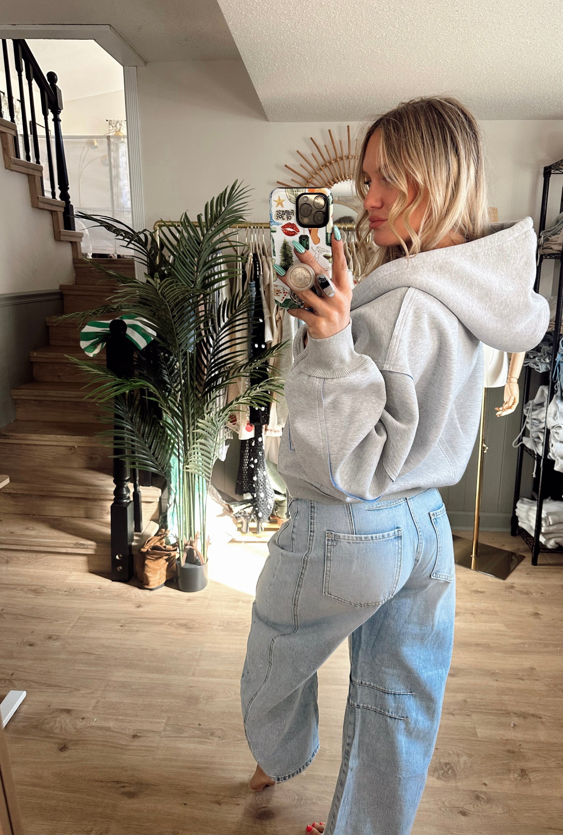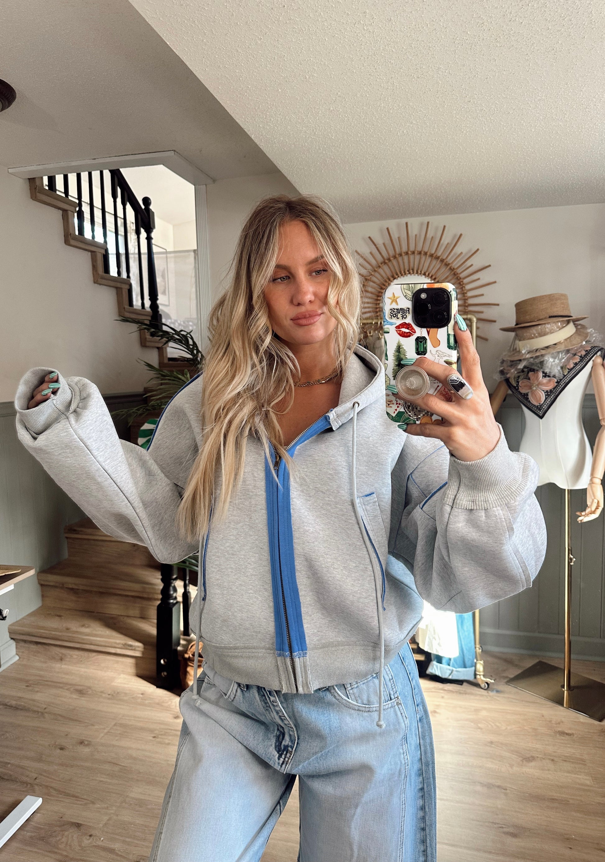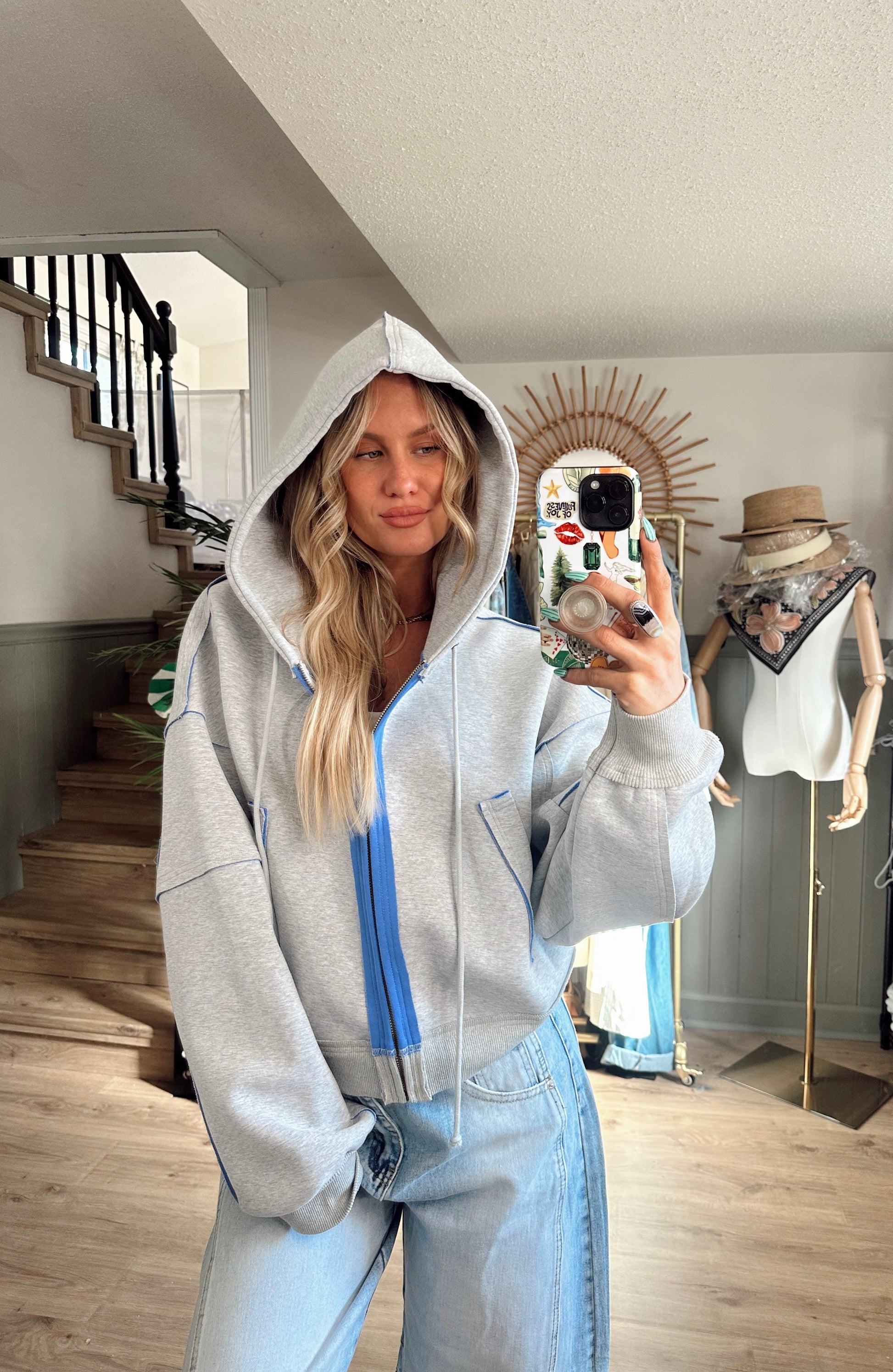 Zip up in style with the Blue Rush Zip Up! This trendy hooded jacket features a contrast seaming design, drop shoulder long sleeves, and a structured fit for a fashionable look. With a front zip closure and ribbed cuffs and hem, you'll stay warm and cozy. Plus, conveniently store your belongings in the hip pockets.