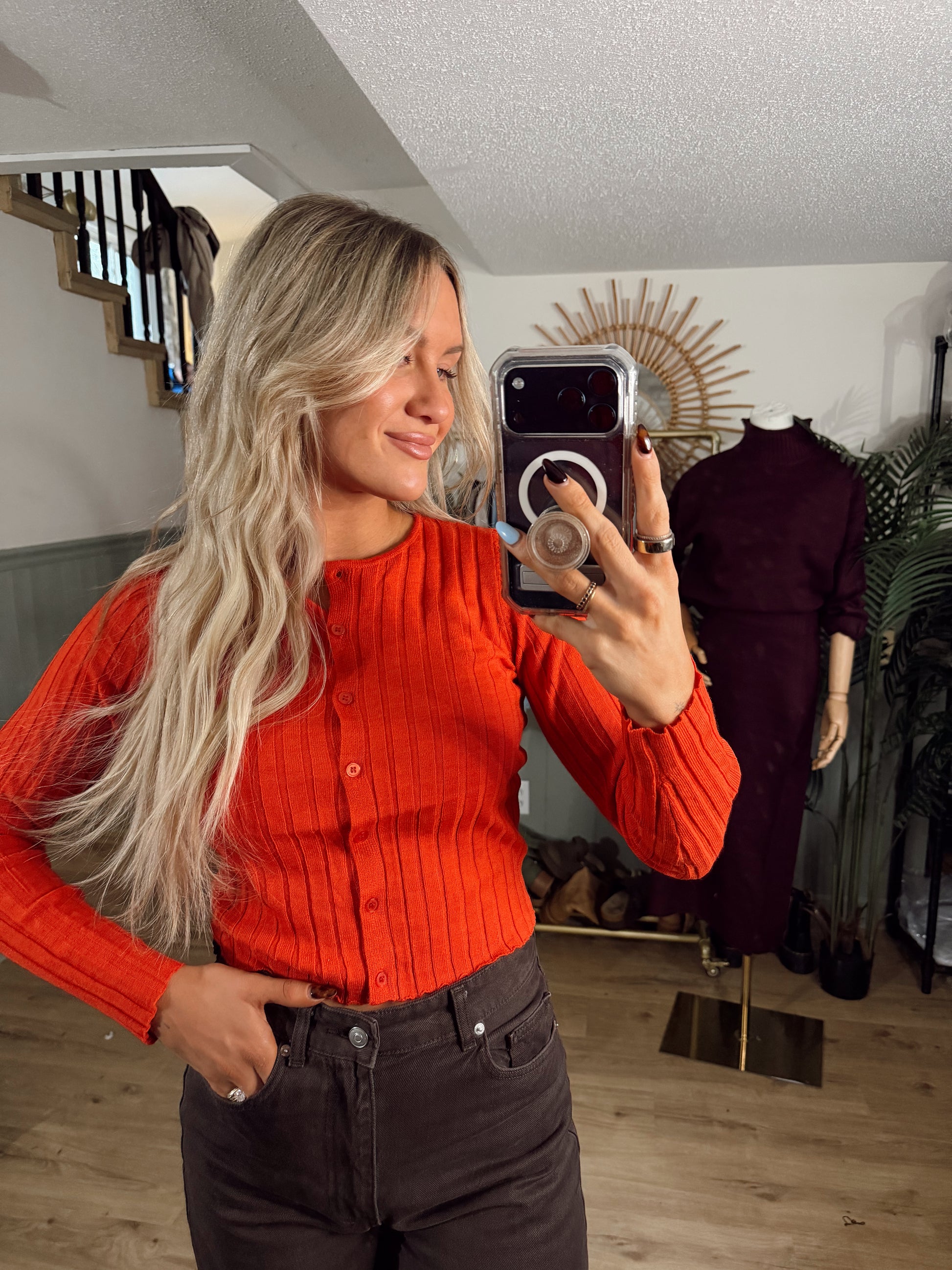 The perfect everyday layer. This ribbed cardigan features a soft knit / shirt feel, a flattering slim fit, and a button-down front. Lightweight, cozy, and easy to style — wear it on its own or layered over your favorite basics.