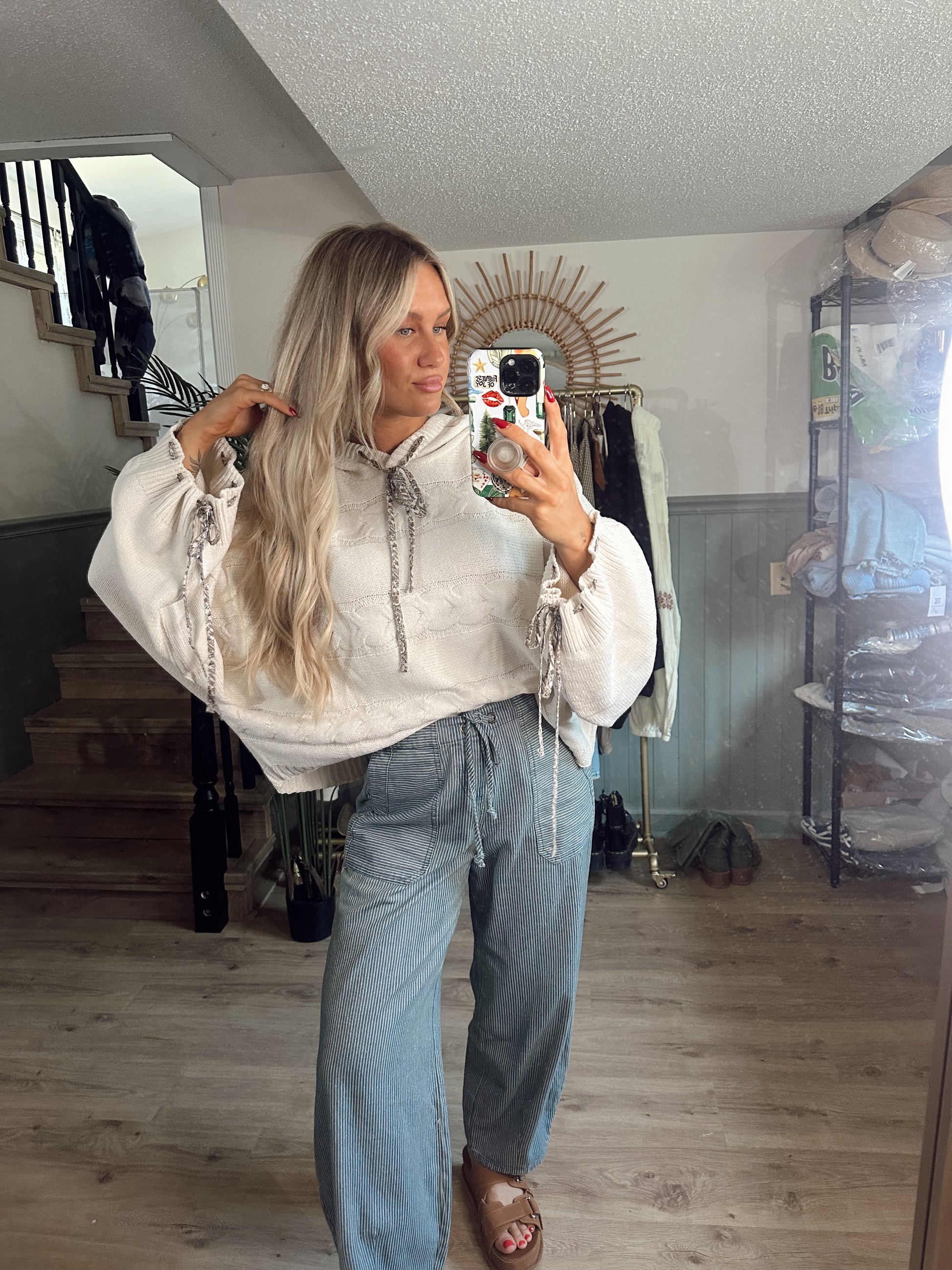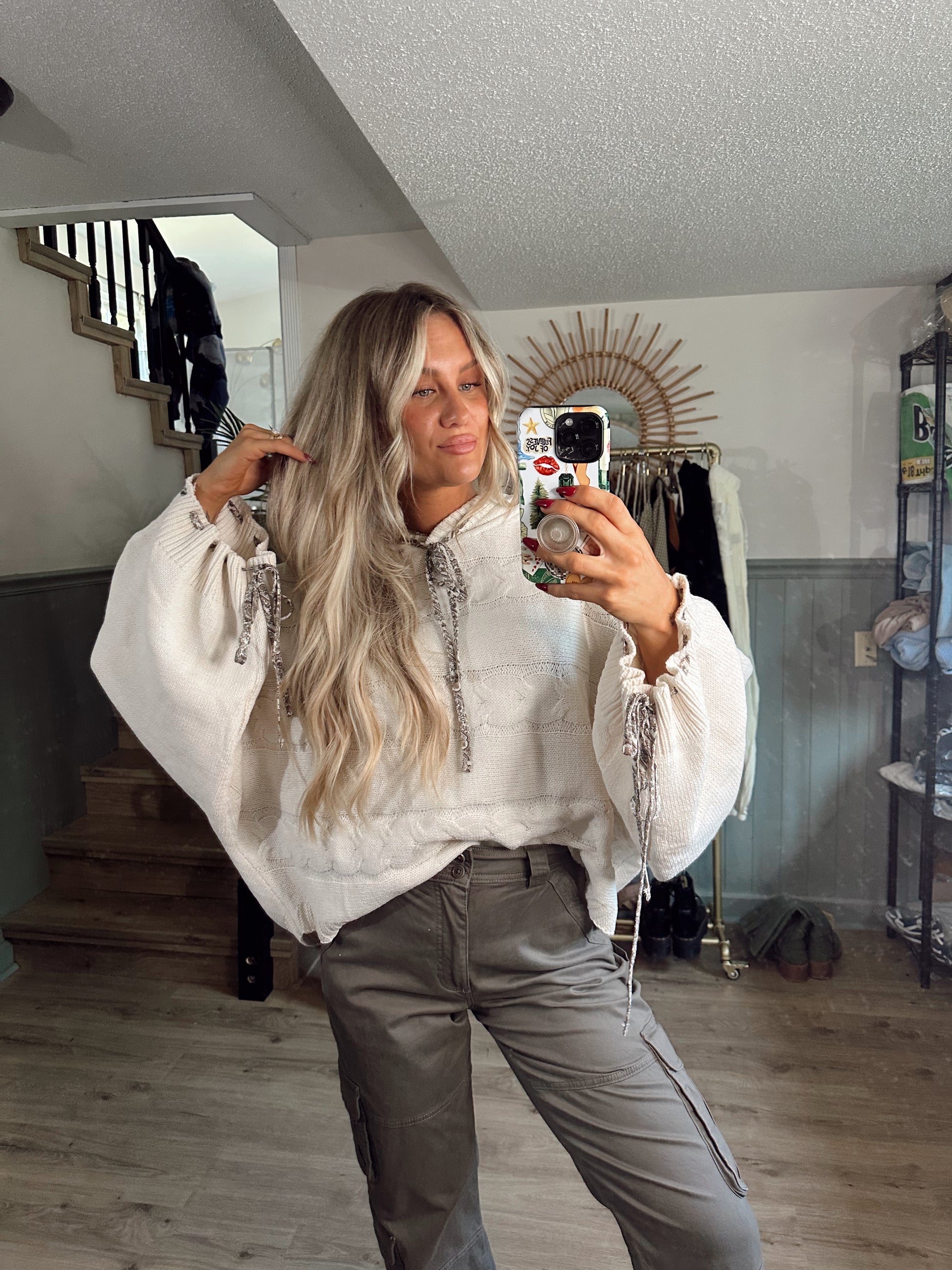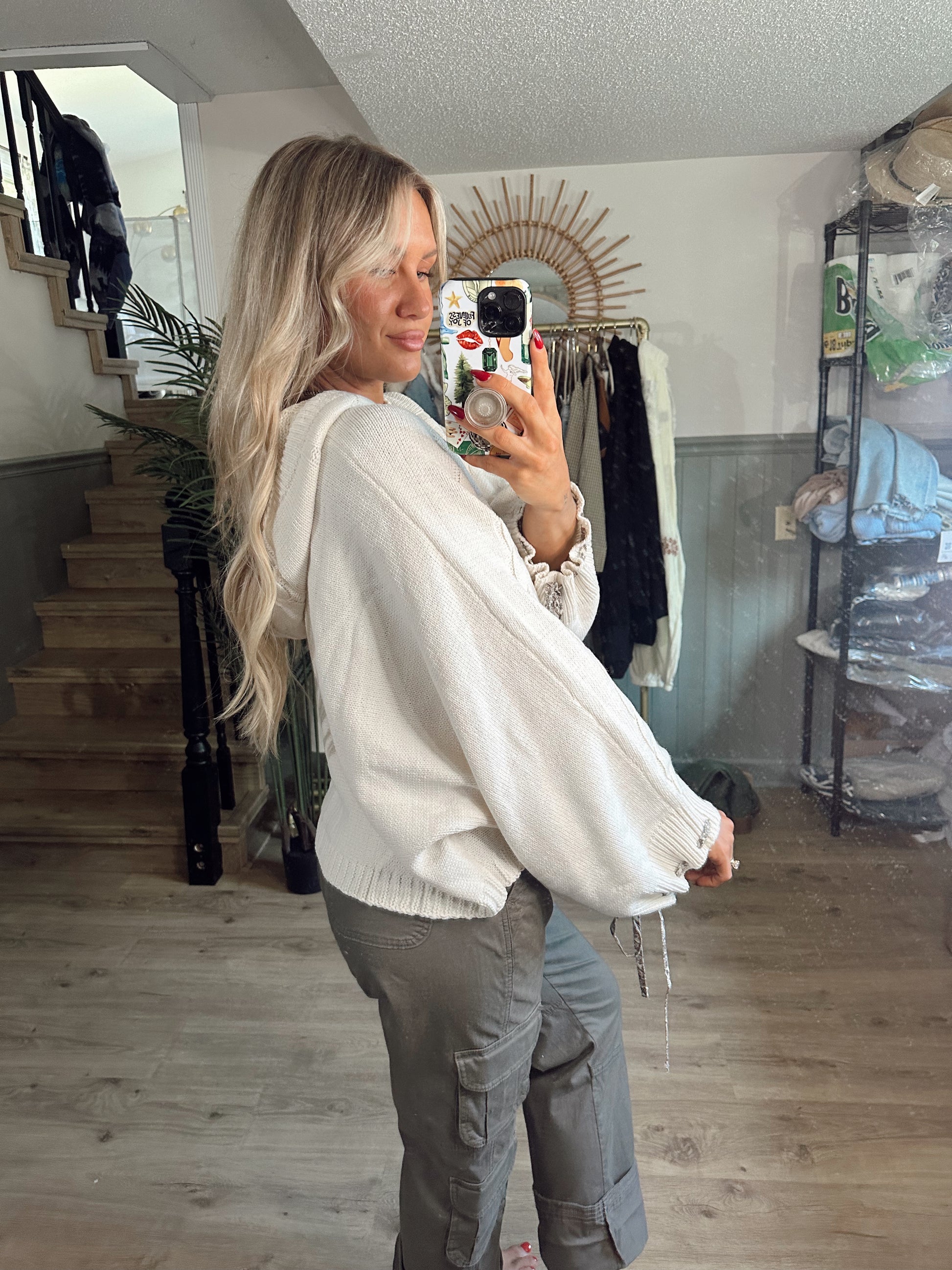 Stay cozy and stylish with our Fireside Hooded Sweater! The balloon sleeves and oversized fit add a touch of whimsy, while the cableknit design screams comfort. The cream color is versatile and the ribbon details on the wrists and drawstring add a charming touch. Perfect for chilly nights by the fire.