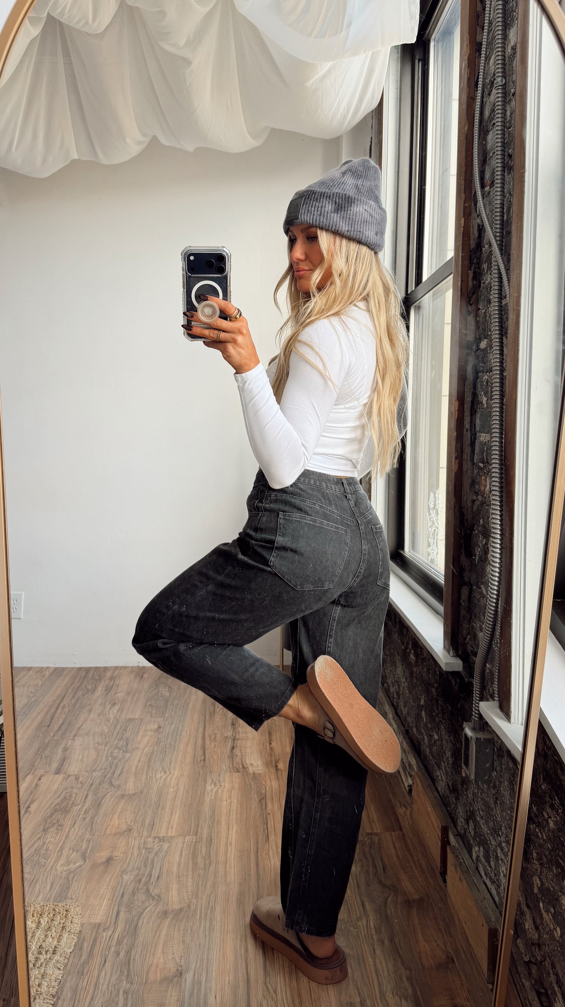 Your new go-to for that laid-back, off-duty look. These washed black pants feature a soft 100% cotton feel with a structured yet relaxed fit that moves with you. The straight leg and slightly cropped inseam give them that effortless “cool girl” silhouette that pairs with literally everything — from fitted tees to oversized knits.