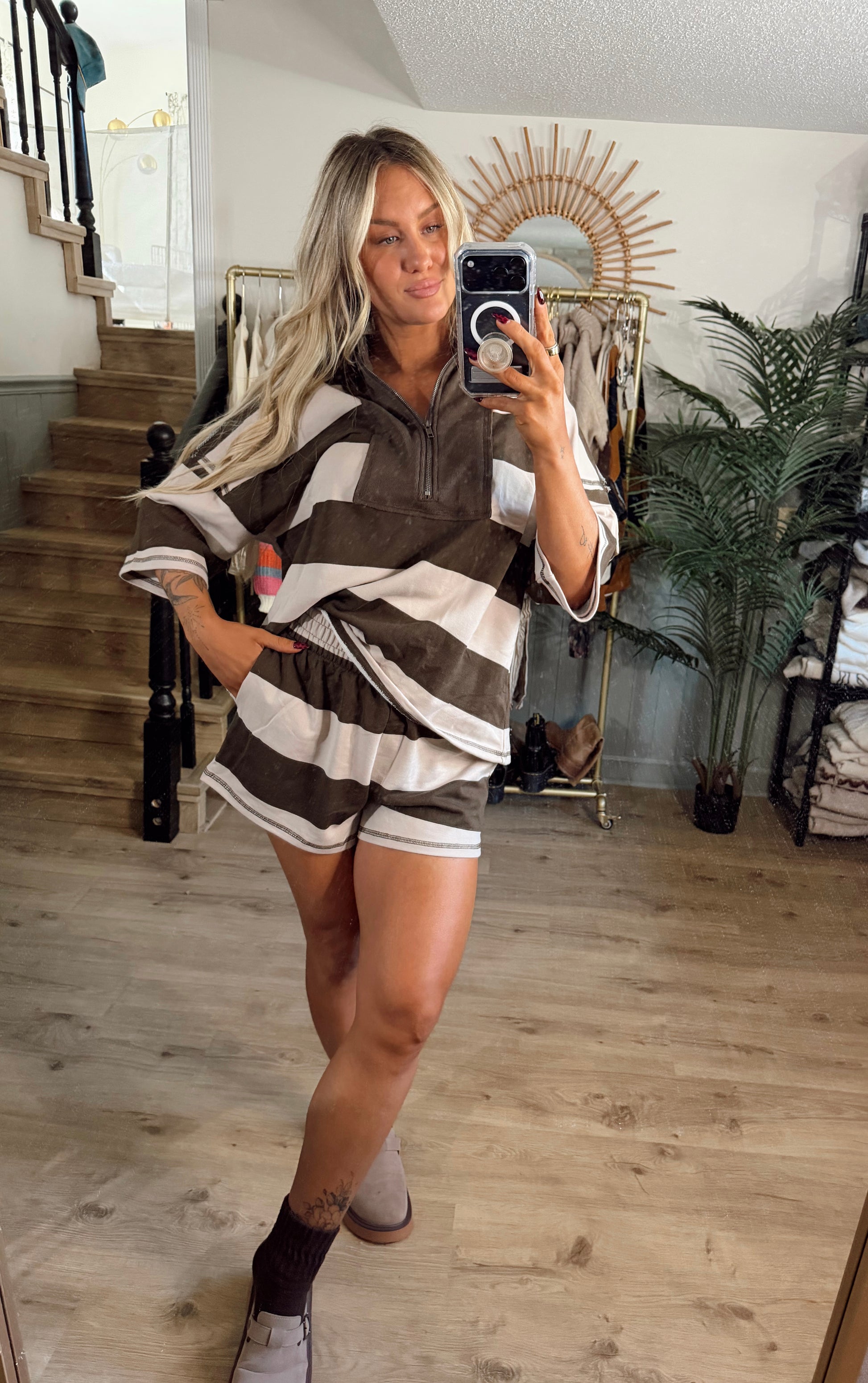 Get ready to lounge in style with our Mocha Stripe Set. This set features an oversize top and shorts, with a trendy stripe pattern and a convenient zip-up design. Made from comfortable material, you'll never want to take this set off. Perfect for a day of relaxation or running errands, this set has got you covered.